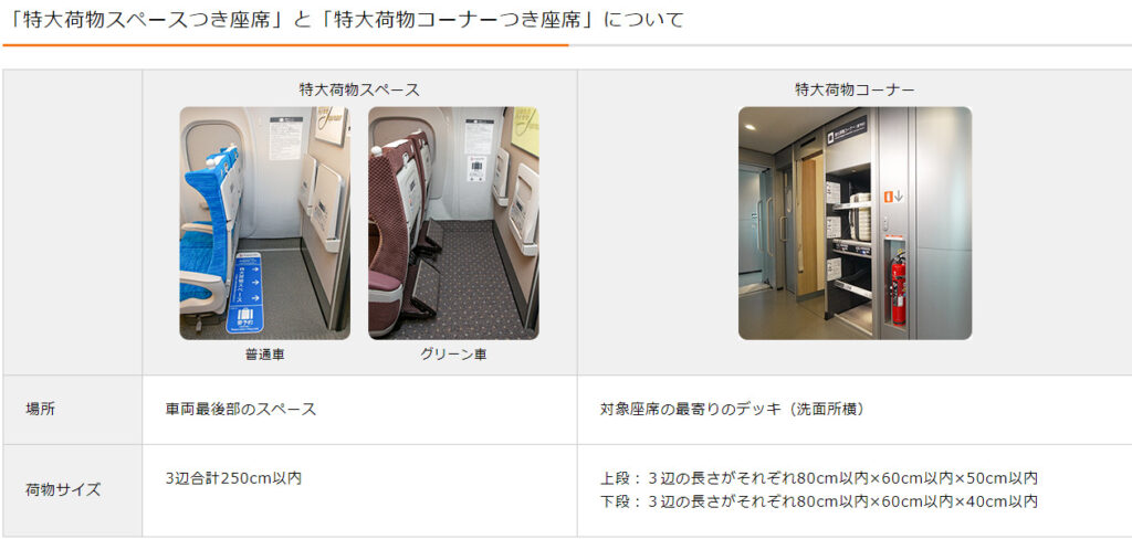 「特大荷物」に該当する大きさのお荷物を持ってご旅行される場合には、「特大荷物スペースつき座席」または「特大荷物コーナーつき座席」 の事前予約が必要です。